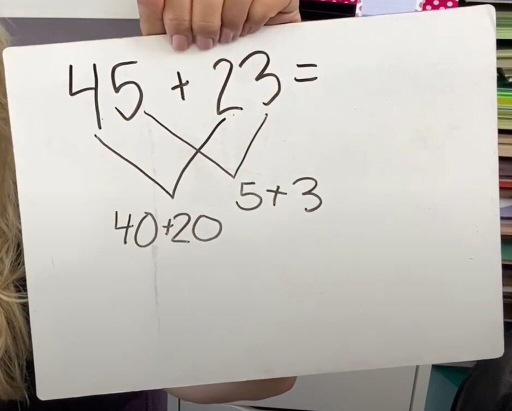 The first thing you’re going to do is write 45+23 across the top of the white board or paper. Students are going to add the two ends together and then the ones together. Because we have written it horizontally, we are going to make two “Vs” to show what we are adding together.