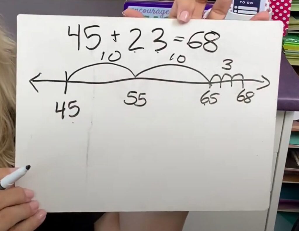 For this method of combining regrouping and new math, you’re not going to start with zero or one on your number line. Instead, you’re going to start with 45 because that is the first number in the equation. Then, you’re going to look at 23. The number is 2 tens and 3 ones.