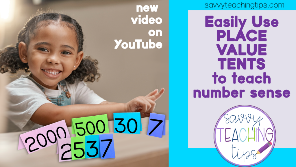 To begin, give your students a number to make with their place value tents. For example, 357. Next, have students build the number. To build this number they would need a 300 tent, a turquoise 50 tent, and a purple 7 tent. When I first start this lesson, I tell my students which color they need to build the number as a guided practice. After I do this with a few numbers, I just write a list and the kids build their numbers. If you’re interested in more details, please watch the video linked below. Just click on the image below.