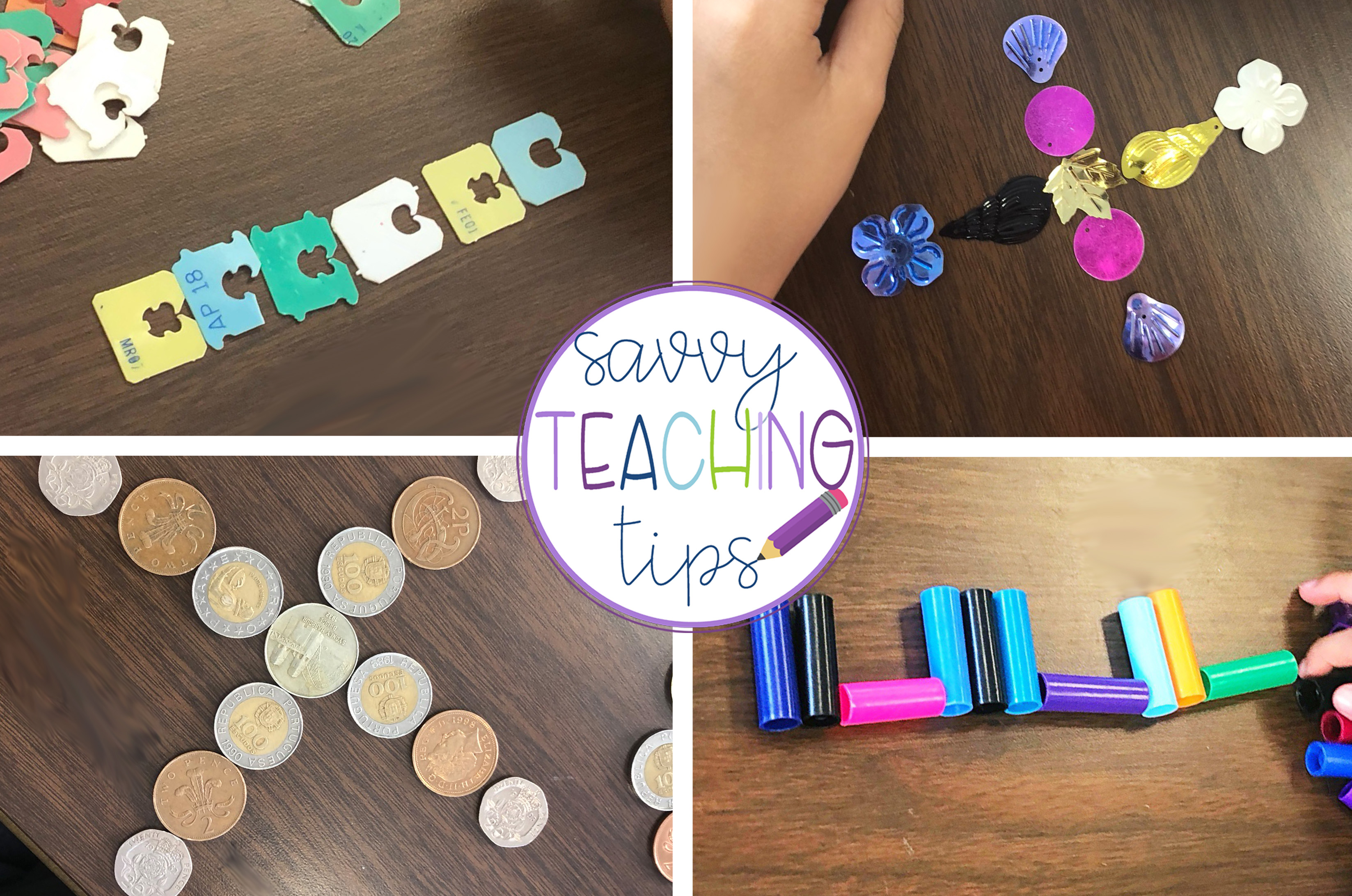 I also use “math junk” as math manipulatives. These are collectables like bread tags, old keys, pop bottle lids, sequins, buttons, foreign coins etc…The kids use them to work on things like patterning in math. But the first thing I do is give them the “math junk” and let them play. Above are some photos of things that they come up with when I give them no instructions. Below are some photos of a patterning lesson we did. I couldn’t have done the second lesson without spending time on the activities above. Some years I can spend a week of lessons just on free play with the manipulatives. It really depends on the class.